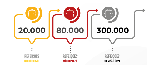 Pelo menos 3 antenas (centros de Apoio) tendo cada uma delas uma estrutura de recolha, logística, confecção e distribuição de alimentos para servir 100.000 refeições para necessitados, com inicio em Julho de 2020, num espaço cedido pela Câmara Municipal de Cascais.